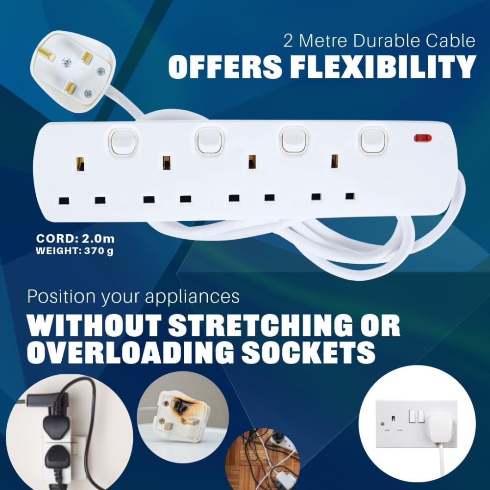 The Mercury 4-Gang Individually Switched Extension Lead is the ultimate white multi-socket power strip, perfect for home and office use, featuring individual switches and neon indicators for superior energy control and safety. This UK-certified extension cable includes a durable 2-meter cord and a wall-mountable design to organize your workspace while preventing standby power waste.