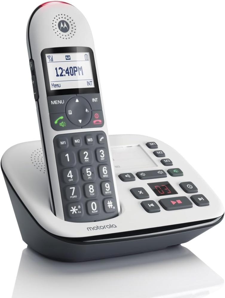 The Motorola CD5012 Twin Handset is a premium cordless landline phone engineered for ultimate clarity, simplicity, and security in your home. Featuring oversized, backlit Big Buttons and Hearing Aid Compatibility (HAC), this phone ensures effortless use and superior audio for all users. The essential Nuisance Call Blocking technology lets you filter up to 50 unwanted numbers for peace and privacy, complemented by an integrated 30-minute digital answering machine.