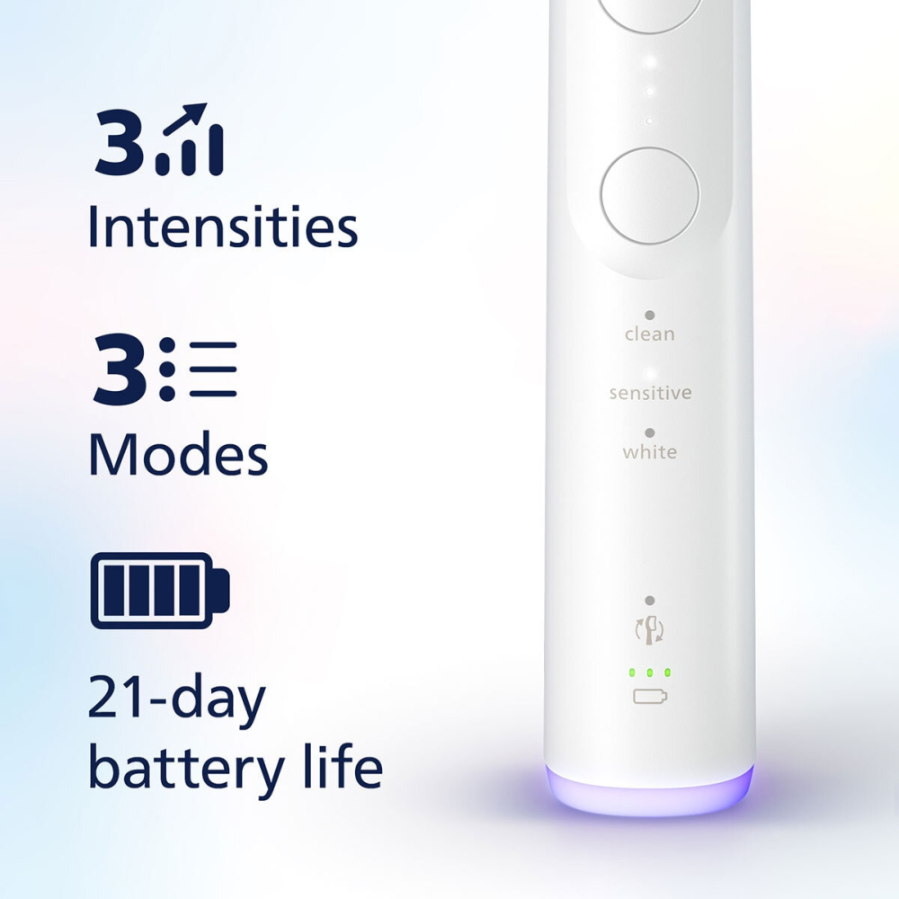 • Customized Clean: Features 3 modes (Clean, White, Gum Care) and 3 intensity settings.
