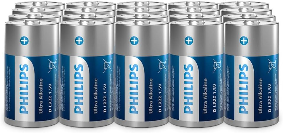Stop settling for short-lived power! The Philips Ultra D Alkaline Battery 20-Pack (LR20) delivers exceptional, high-capacity energy engineered to meet the demanding needs of your largest and most frequently used devices. Perfect for high-drain electronics like powerful flashlights, emergency radios, industrial equipment, and large motorized toys, these batteries ensure your essential devices stay running when you need them most. Featuring advanced Alkaline technology and a reliable leak-proof design, this bulk pack provides professional-grade performance and incredible value, giving you peace of mind that you always have backup power ready.