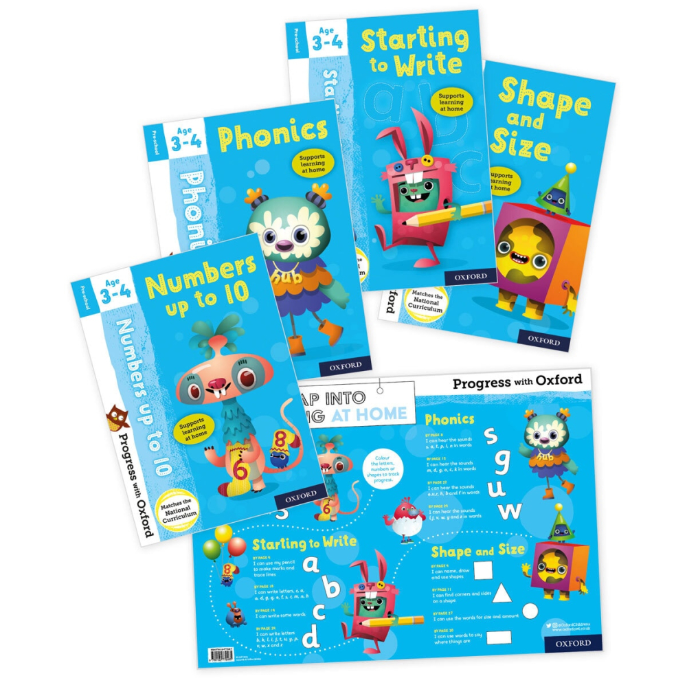 Progress with Oxford x4 Book Collection with Poster in 4 Options: Starting to Write, Write Words, Counting up to 100 or Time & Money