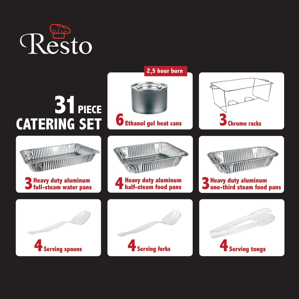Elevate your next event with the ultimate Resto 31 Piece Catering Set, designed for professional presentation and effortless serving. This all-inclusive buffet warmer kit ensures your food stays perfectly heated and beautifully displayed, making it ideal for weddings, corporate functions, holiday parties, and large family gatherings. With heavy-duty components and easy-to-use gel-heat chafing fuel, you can deliver a premium catering experience every time. The comprehensive 31-piece collection is a must-have for caterers and hosts who demand quality and convenience.