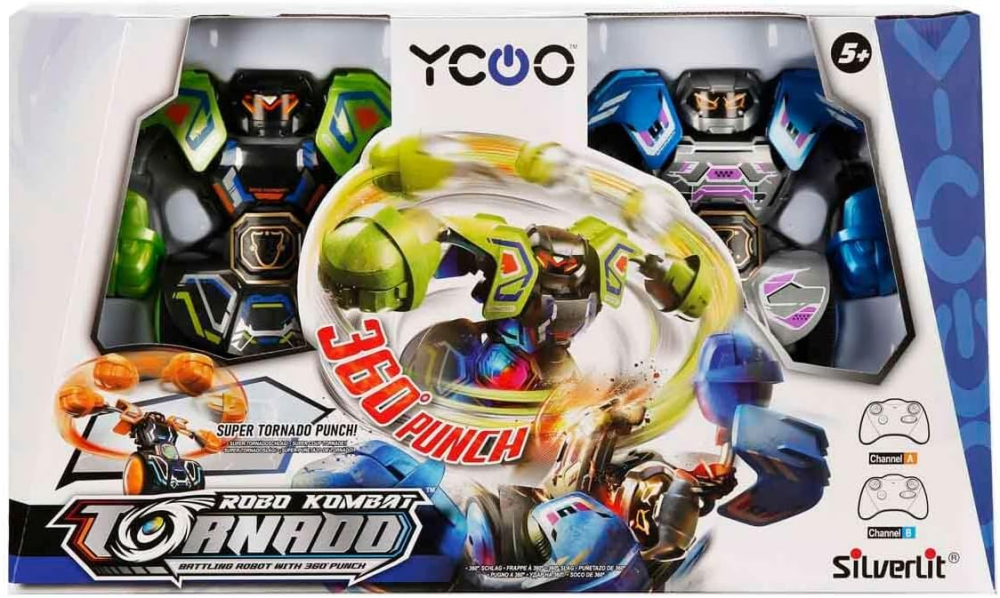 Unleash epic battles with the SilverLit YCOO Robo Kombat Tornado, an interactive robot fighting toy twin pack perfect for kids aged 5+. Featuring the devastating Super Tornado Punch and immersive sound effects, this durable plastic set supports thrilling multiplayer matches or challenging solo play against an intelligent AI opponent.