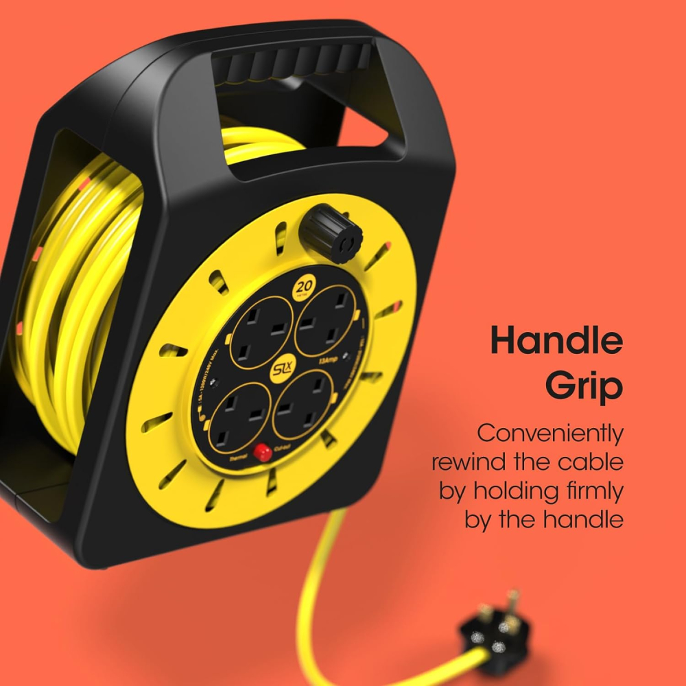 SLx Extension Lead 20m 4 Socket Extension Reel, Heavy Duty Extension Cable Thermal Cut Out Extension Lead for Garden Lawn Mower Office 13A Fused UK Plug