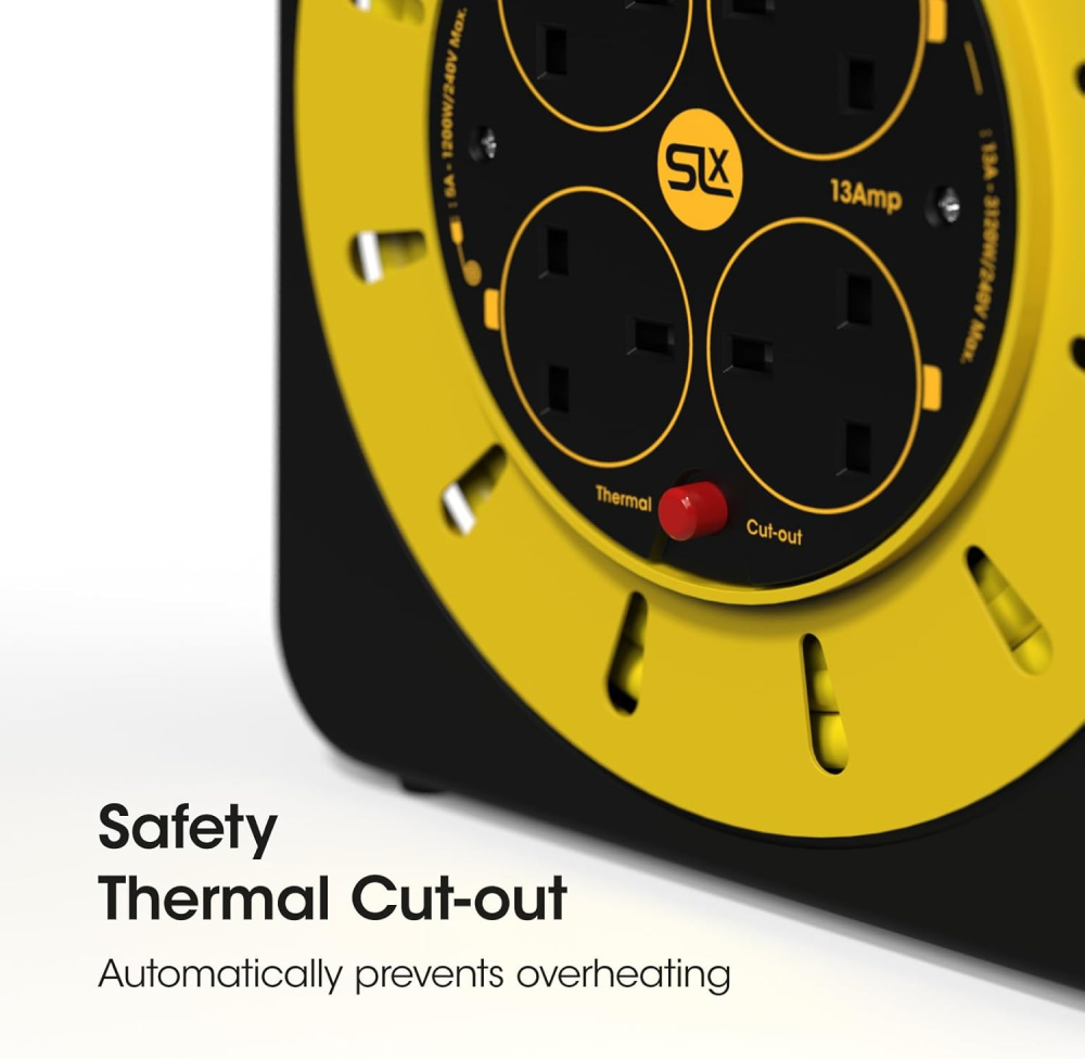 Instantly extend your power reach up to 20 meters with the SLx Heavy-Duty 4 Socket Extension Reel. Engineered for maximum safety and performance, this robust cable reel is the essential power solution for professionals, serious DIY enthusiasts, and general household use. Featuring four reliable UK power sockets and a crucial built-in thermal cut-out switch, it guarantees superior protection against overloads for both your equipment and your safety. The integrated winding handle ensures tangle-free storage and effortless deployment, making it perfect for powering high-demand tools like lawn mowers, power drills, and workshop machinery, both indoors and across large outdoor spaces.