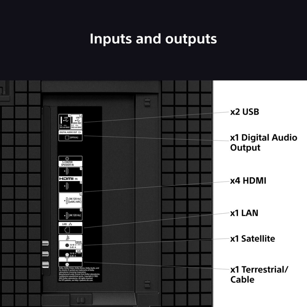 4 x HDMI (4 x 2.1)(HDMI eARC), 2 x USB, 1 x CI Slot, 1 x RF In, 1 x IF In, 1 x SPDIF (Optical Digital Audio Out) |
