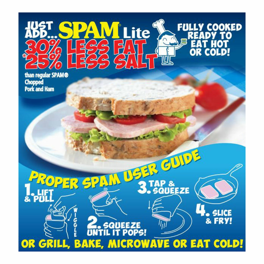• SPAM Lite Formula: 33% fewer calories, 50% less fat, and 25% less sodium compared to SPAM Classic.