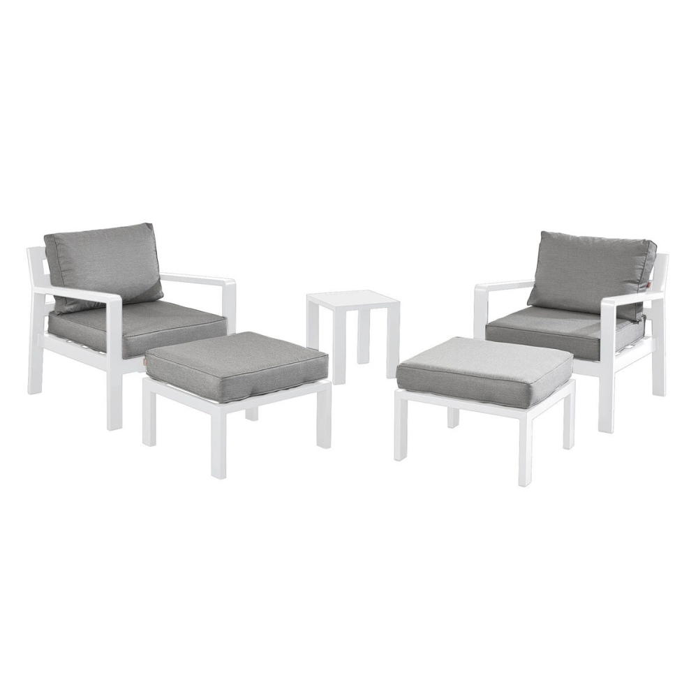 Transform your garden or patio with the Stone Garden 5 Piece Armchair and Footstool Patio Set in White. This premium, contemporary, all-weather furniture collection is built with a rust-resistant aluminum frame and UV-resistant fabric, offering ultimate comfort and minimal maintenance year after year.