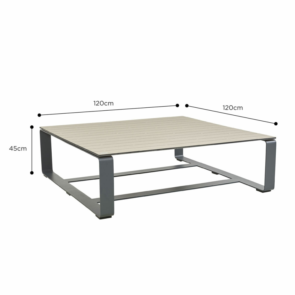 • HPL Tabletop: Square table includes a scratch and weather-resistant wood-effect High-Pressure Laminate top.