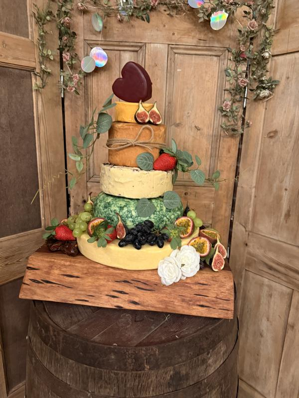 Bought this for our evening wedding reception and it was awesome! Went down a storm, everyone loved it! So much better and more appealing than a traditional cake, which in my experience, not many people even want to eat! Had so much positive feedback and there is plenty to go round. 5 stars without a doubt! And to the supplier, just superb!! Delicious cheese, the large bottom tier, the cave aged cheddar is absolutely delicious! Best cheddar I’ve ever tasted. Thank you! One very happy newly wed couple!