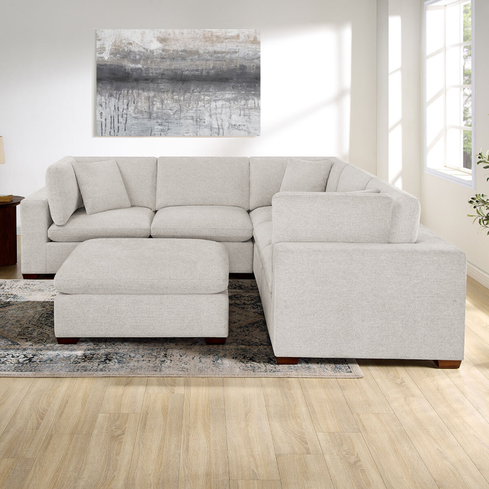 Transform your living room with the Thomasville Lowell Light Grey Fabric 6 Piece Modular Sofa. This versatile sectional features a highly adaptable 6-piece design, premium durable light grey fabric, and deep, plush seating for superior modern comfort. Perfect for large families and dynamic spaces, it also includes a convenient integrated storage console.