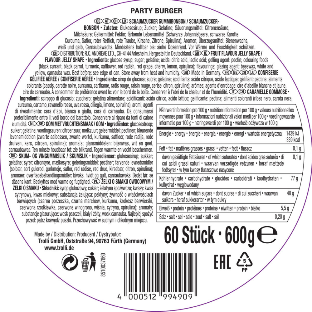 - Iconic, layered Trolli burger design with bursts of fruity flavor.