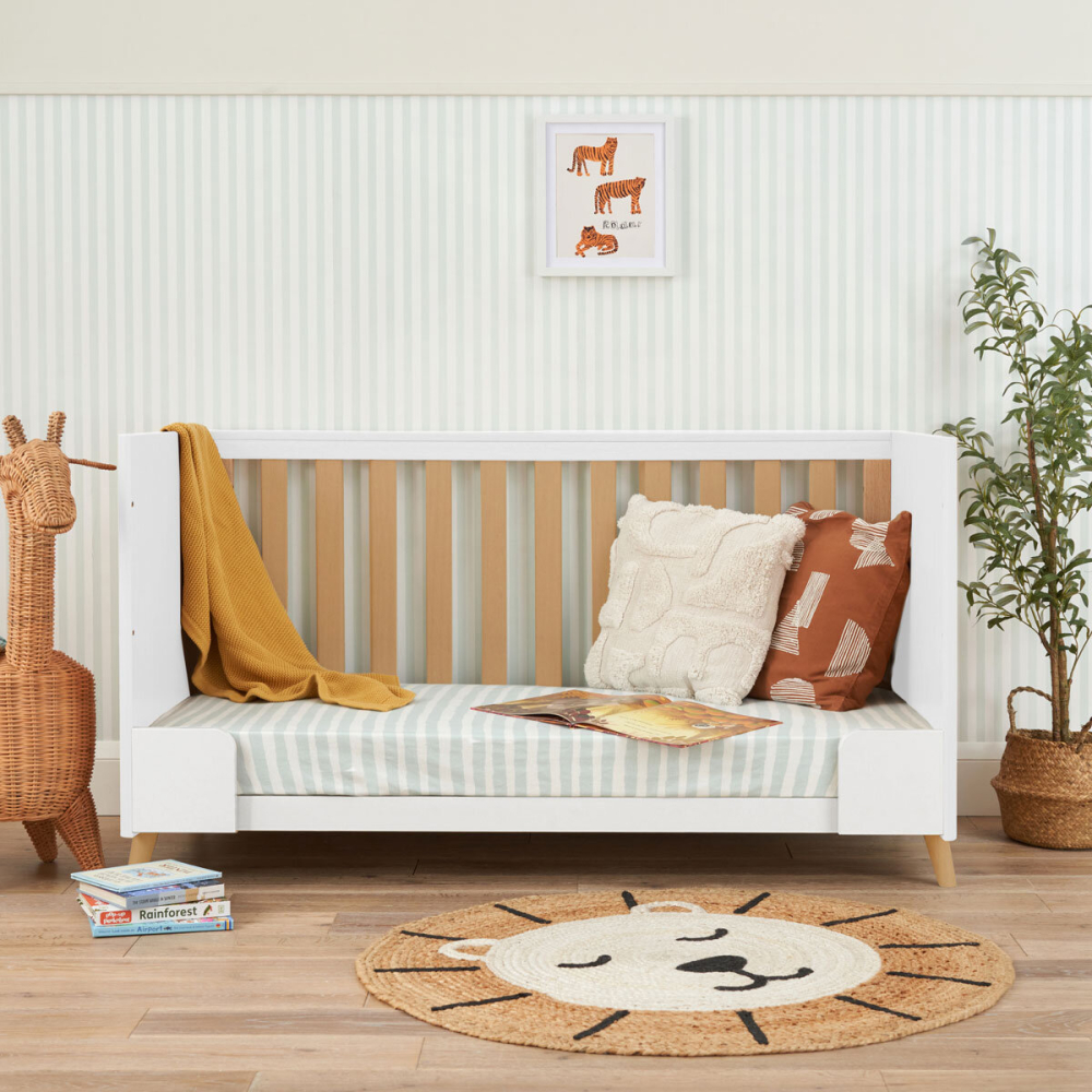Elevate your nursery with the premium Tutti Bambini Fika Cot Bed and Sprung Mattress Bundle in White & Light Oak. This versatile 3-in-1 piece features clean Scandinavian style, converts easily to a toddler bed or day bed, and includes a supportive 140×70 cm sprung mattress for essential newborn safety and comfort.