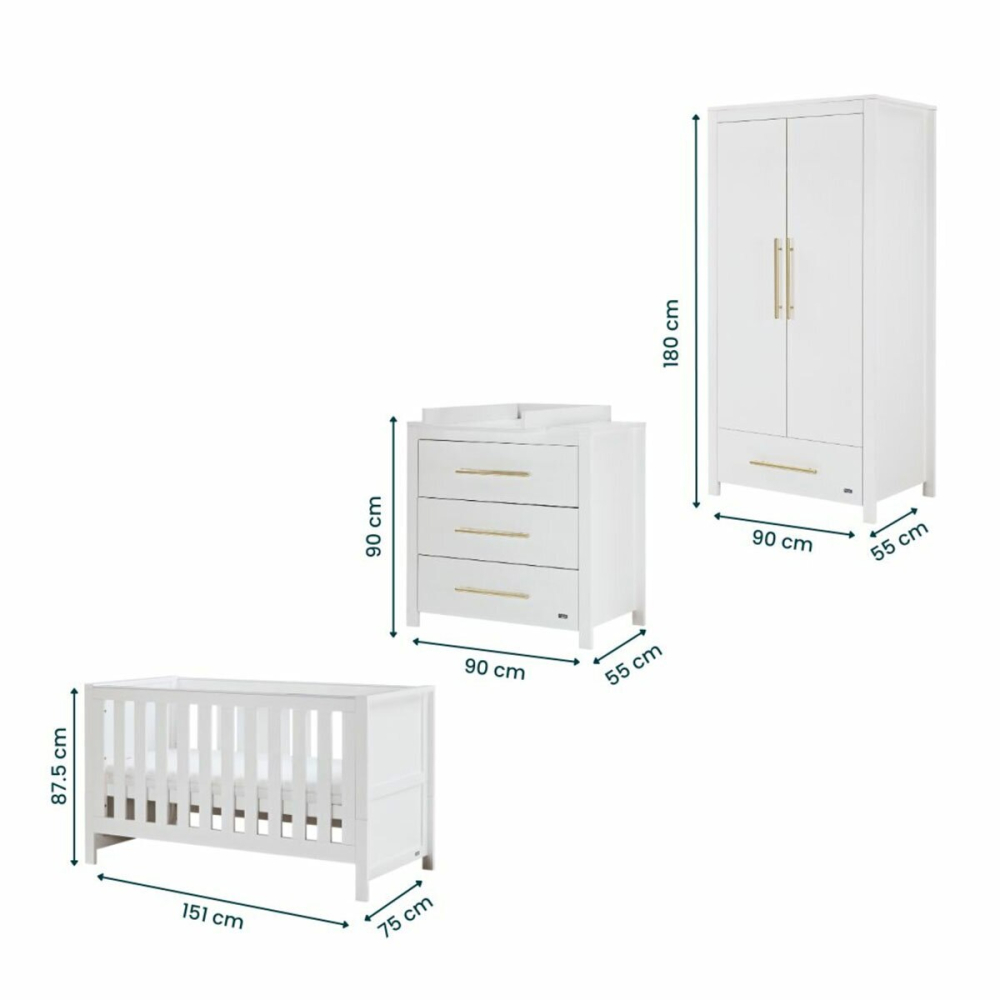 - 4-Piece Complete Nursery Solution: Includes Cot Bed, Chest Changer, Wardrobe, and Sprung Mattress.
