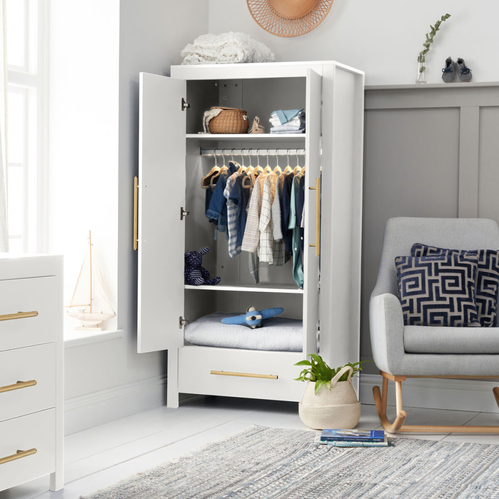 Create a stylish and safe nursery foundation with the luxurious Tutti Bambini Tivoli 4 Piece Nursery Set in White. This essential furniture bundle includes a convertible cot bed, chest changer, spacious wardrobe, and a premium sprung mattress, offering a complete, long-lasting solution from newborn to toddler.