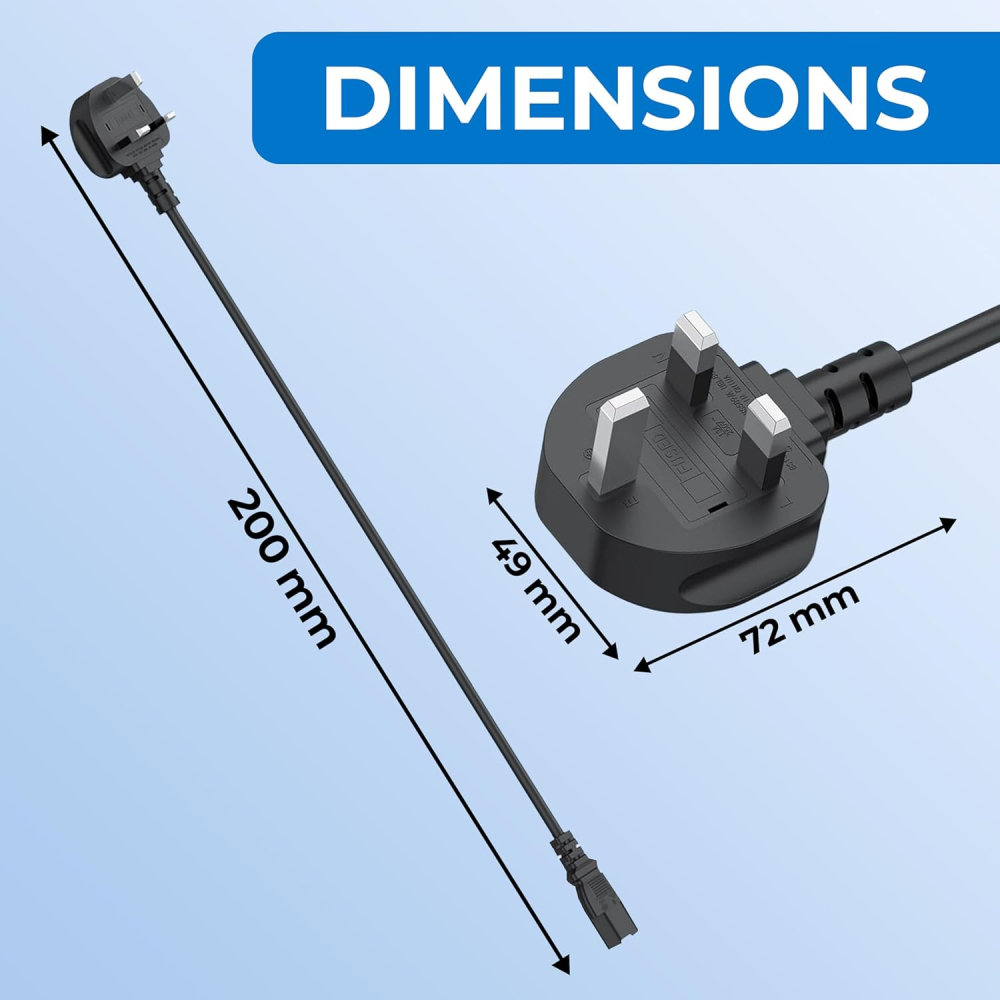 • Connector Type: UK 3-Pin (Male) to IEC C7 Figure 8 (Female).