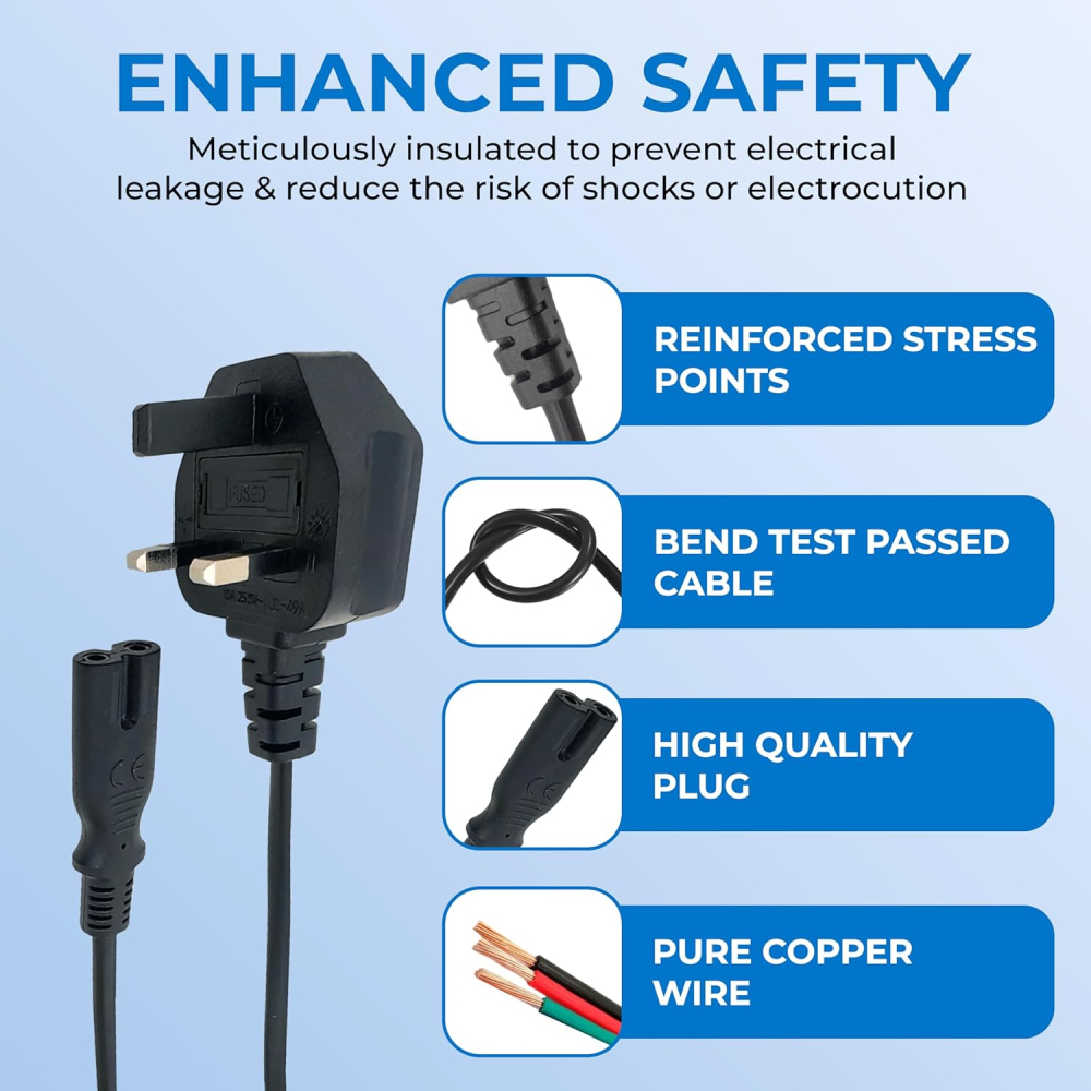 16 reviews for UK 3-Pin Plug to IEC C7 Figure 8 Power Cable, 2 Meter, BS1363 Certified Plug with 10A Fuse, VDE Approved Cable, CE Certified Connector | Compatible with Printers, Game Consoles, Set-Top Boxes & More