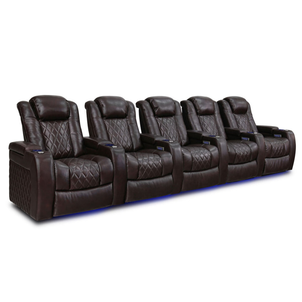 Product Overview: Valencia Tuscany Row of 5 Brown Leather Power Reclining Home Theatre Seating – The Ultimate Cinema Experience