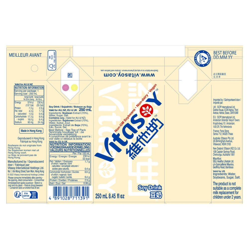 Stock up on Vitasoy Soy Drink, the ultimate plant-based refreshment, with this convenient 24-pack of 250ml cartons. This non-dairy, cholesterol-free drink is made from Non-GM soybeans, delivering 7g of high-quality protein per serving for a wholesome, on-the-go boost. It’s the perfect natural alternative for health-conscious consumers, vegetarians, and vegans.