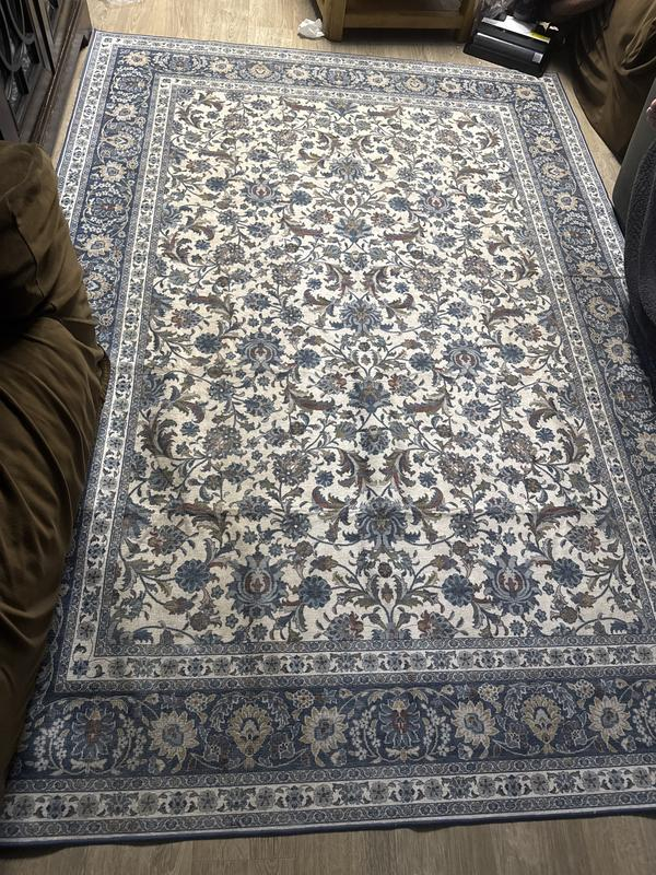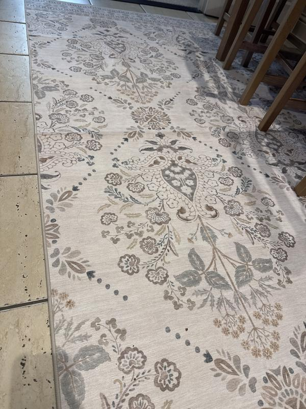 I have had this for a few weeks now and it’s sitting under my dining table. It hasn’t laid completely flat yet and still has the creases that it came with. This didn’t arrive rolled up like a traditional rug, instead it arrived folding like a blanket, which created semi-permanent creases. I tried steaming it and it’s still bumpy. The actual rug itself is nice though, the pattern is lovely and it looks like a good quality. I haven’t tried to clean it yet, but hopefully there’s no issues.